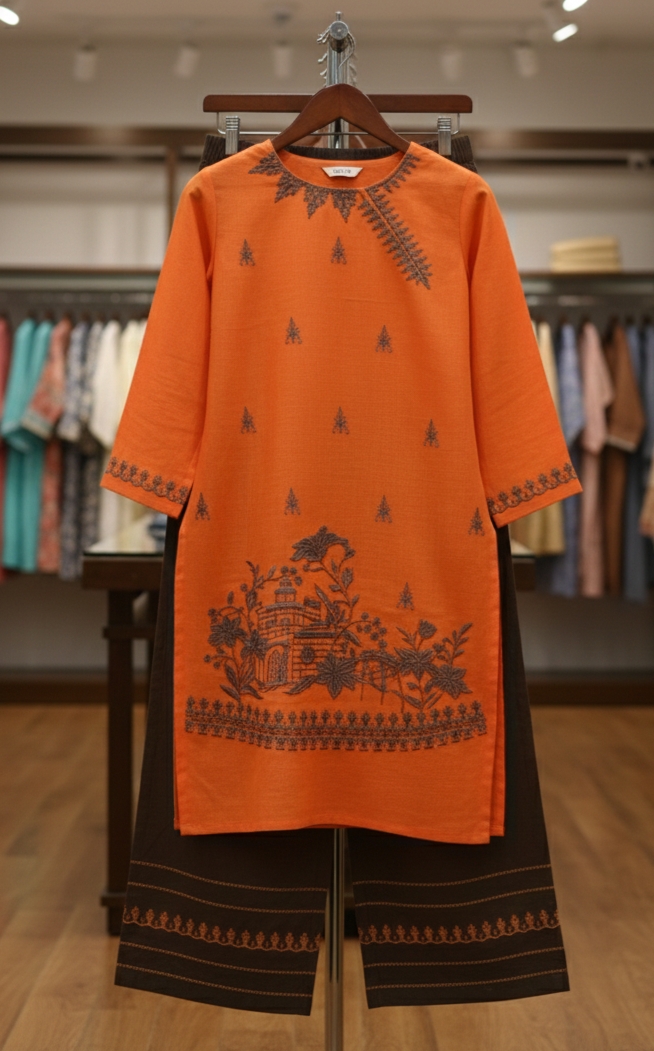 Bright orange kurti par classy brown ethnic print aur matching trousers is dress ko stylish aur comfortable dono banate hain.
