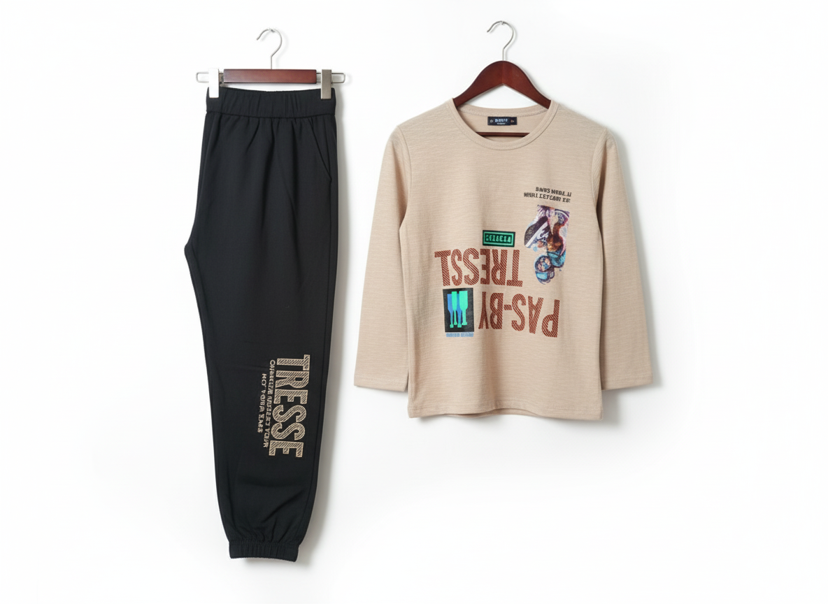 Trendy light tea brown kids boys outfit with printed shirt and trouser – stylish, soft, and ideal for everyday wear.