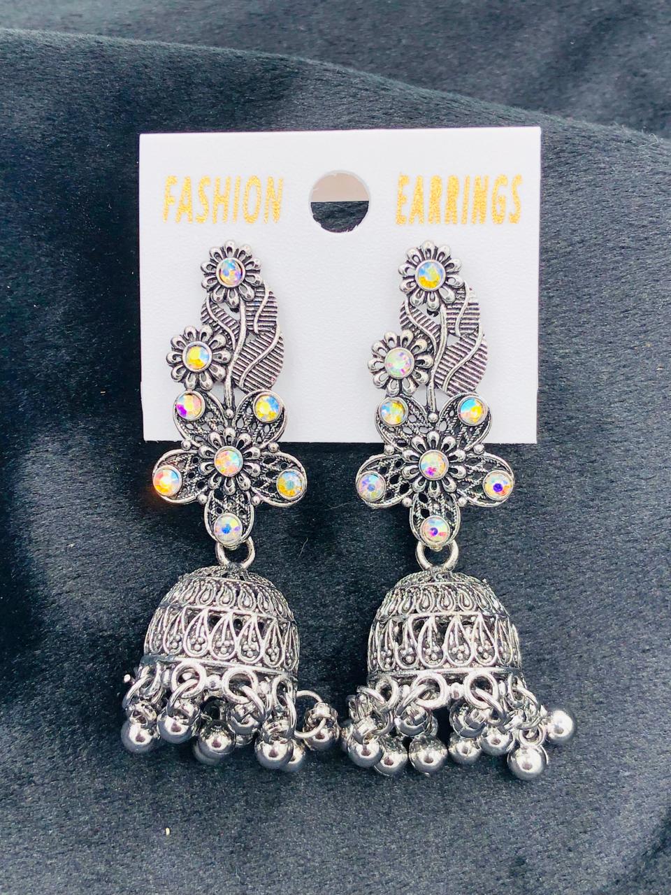 Elegant oxidized silver earrings featuring a floral top and filigree detailing with multi-color sparkling stones—perfect for parties, casual wear, and festive styling. In