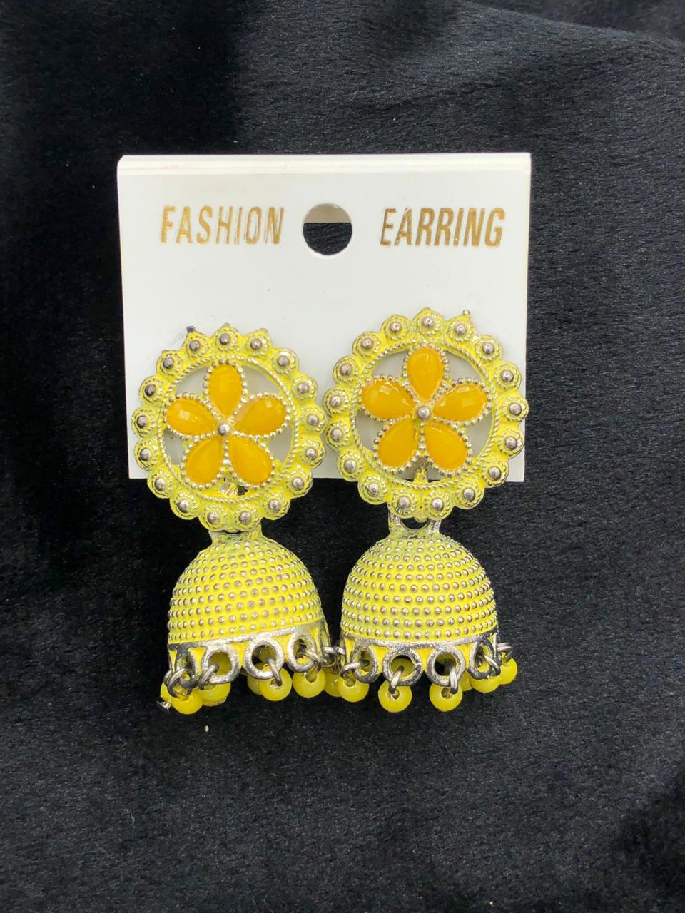 These beautiful yellow floral jhumka earrings are designed to complement a wide range of outfits—traditional or western. The floral top paired with the detailed jhumka bottom creates a charming and elegant look. Lightweight, fashionable, and perfect for parties, functions, or everyday style.