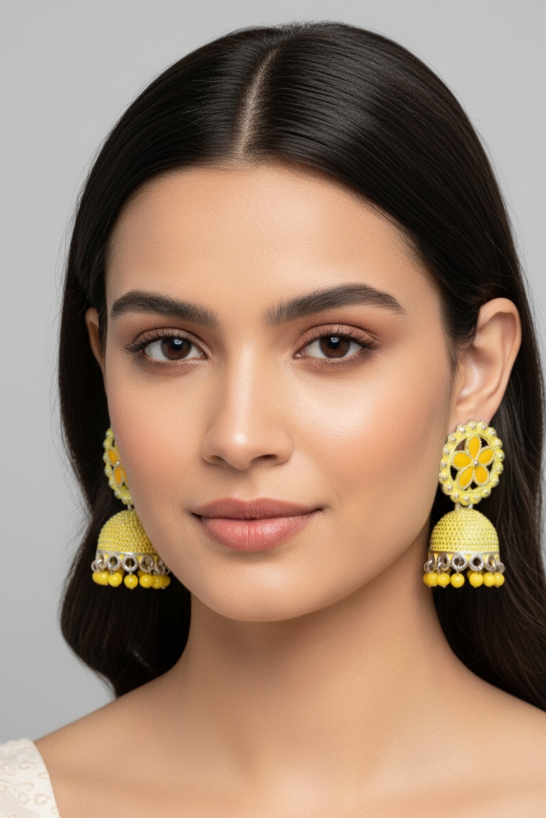Trendy yellow floral jhumka earrings that perfectly match with any outfit and add a bright, stylish touch.